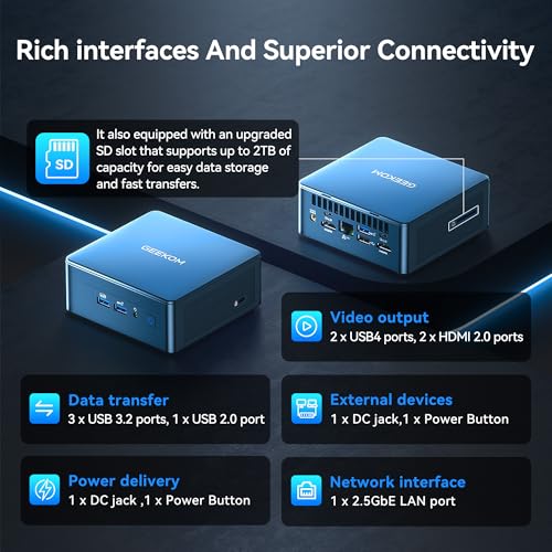 [Intel Iris Xe 8K Graphics & Support for Up to 4 Displays] Equipped with Intel Iris Xe graphics, the GEEKOM IT12 2025 has 2 USB4.0 ports (support DP1.4, 8K@30Hz) and 2 HDMI 2.0 ports (4K@60Hz). This allows you to connect two 8K displays and two 4K displays simultaneously (a total of four monitors). Ideal for multitasking, gaming and crisp, vivid viewing.