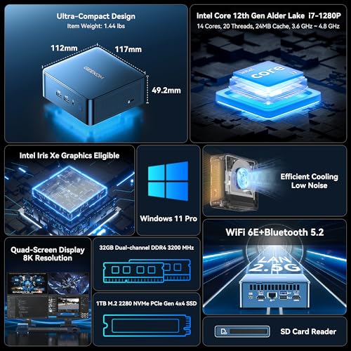 GEEKOM Mini PC IT12 2025 Edition, 12th Gen Intel i7-1280P, 32GB DDR4 RAM & 1TB M.2 2280 NVMe Gen4*4 SSD, Windows 11 Pro Mini Desktop, 8K/Quad Display/USB4.0/WiFi 6E/BT5.2