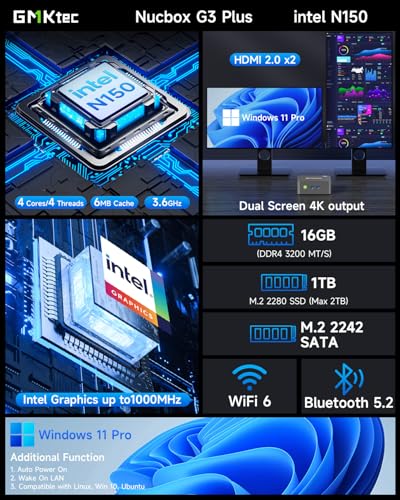 GMKtec G3 Plus Mini PC, Intel Twin Lake N150(upgraded N100) 16GB RAM 1TBB M.2 2280 NVME PCIE3.0 SSD, Mini Desktop Computer Support Windows 11 Pro/Dual HDMI/WiFi6/BT5.2