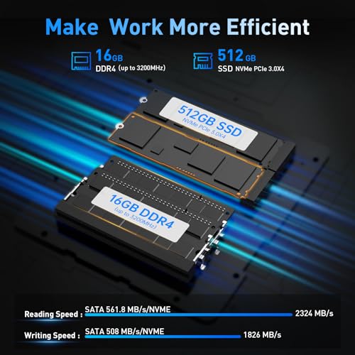 【Huge Storage & Expandable Option】The Mini Computer is built-in dual channel 16GB(2x8GB) DDR4 (3200MHz) which is 90% better than single channel,and 512GB M.2 2280 NVMe SSD, with read speed 2324MB/s, write speed 1826MB/s. Also, you can expand the RAM up to 64GB by the 2 SO-DIMM slots, and expand ROM up to 2TB by adding a 2.5” SATA SSD. Enough storage space for you to store your work files or privacy documents, no need to worry about insufficient space or leakage of personal informations.