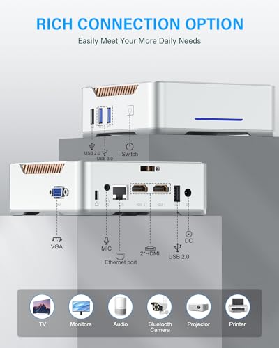 【WIFI+BT MULTIPLE CONNECTIONS】Micro Desktop Computer comes with WiFi-5 and Bluetooth 4.2, which ensures that mini PCs can easily connect to wireless devices and networks. Wireless devices for mouse/keyboard was plug and play. Simply compatible – It can work with server, monitoring equipment, office equipment, monitor, projector, TV and so on.