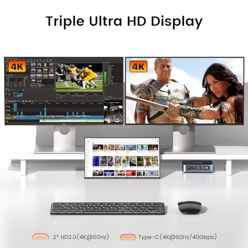 【Dual HD Port, 4K Triple Screen Display】—— Mini desktop computer is equipped with UHD Graphics (750MHz max), delivers powerful graphics performance, supports 4K video playback, connect PC to a projector as a home theater, enjoy a variety of entertainments. Two HDMI 2.0 and full function Type-C ports allow you to efficiently multitask on triple 4K@60Hz displays.
